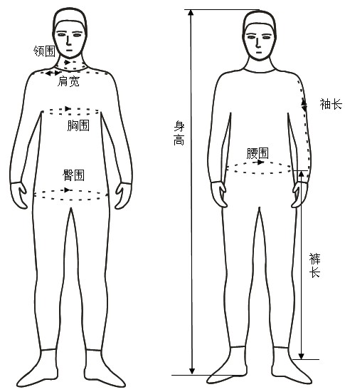臂长:身体站直,双手自然下垂,用皮尺从肩点量到手腕处,即为您的臂长尺寸。